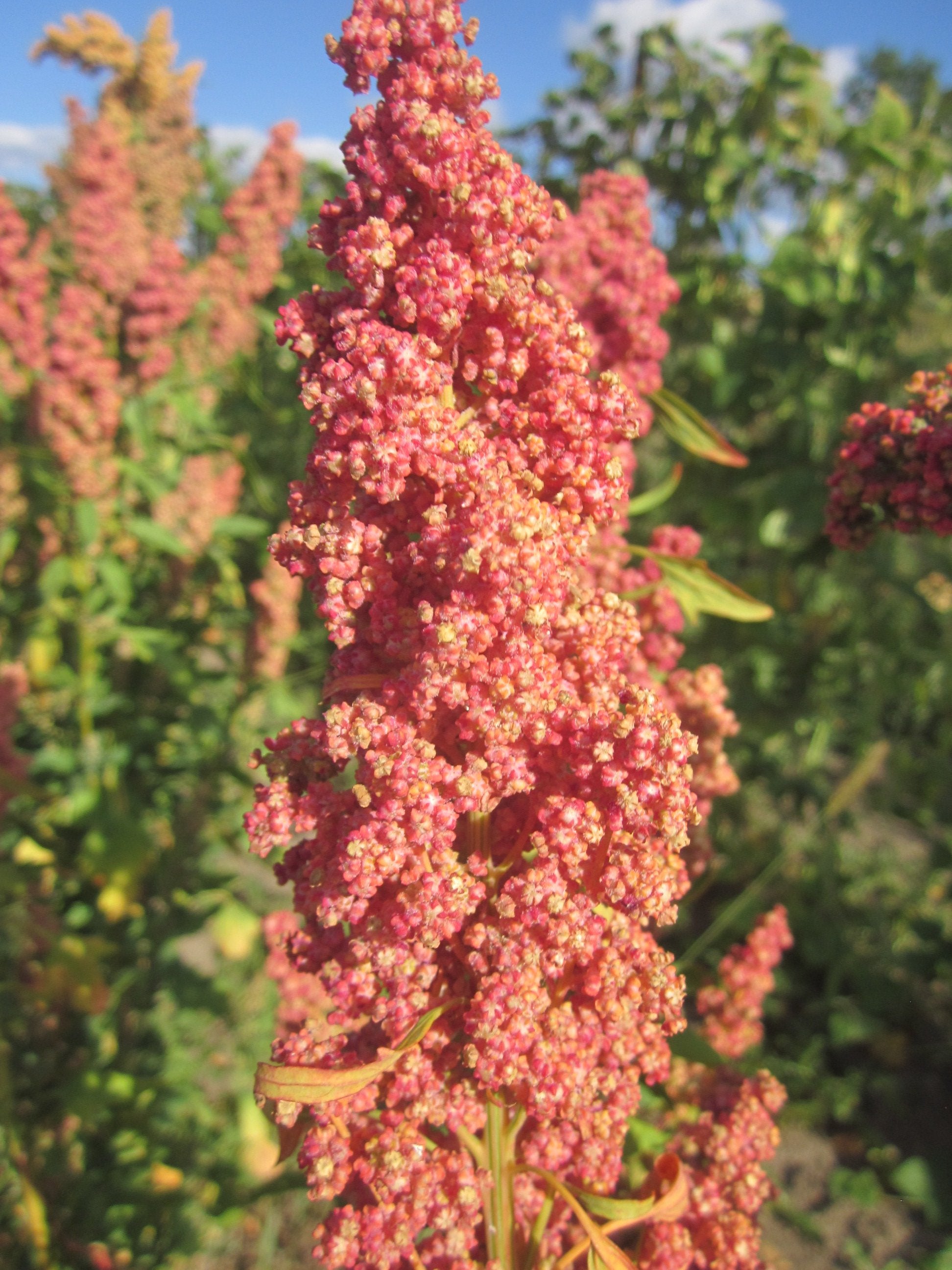 Direct sow in late April thru mid-May when nights are still cool and soil has warmed to 18-24ºC. Sow seeds 0.6 cm deep, 2.5 cm apart for baby greens and thin to one plant every 30 cm for leaf harvest followed by grain harvest. Grow in full sun in rich, well-drained soil. Quinoa is not bothered by birds or many insects and is very drought tolerant. Harvest seed heads when the first seeds begin to shed in late summer. Lay plants on a tarp outside or inside if the weather is wet. Allow to ripen for a few days then thresh the seed by shaking the dried seed heads over the tarp. Very easy to grow and very beautiful. Annual