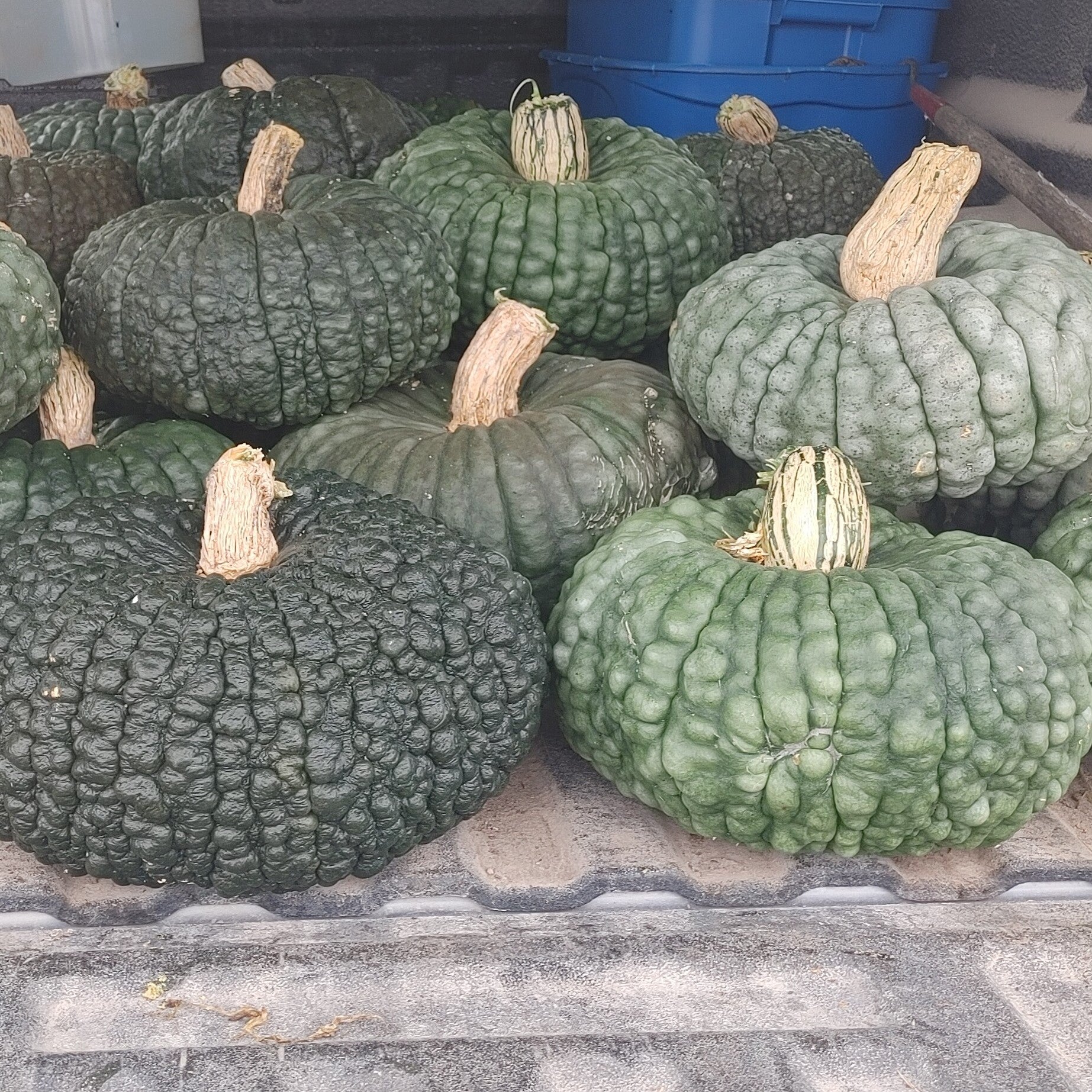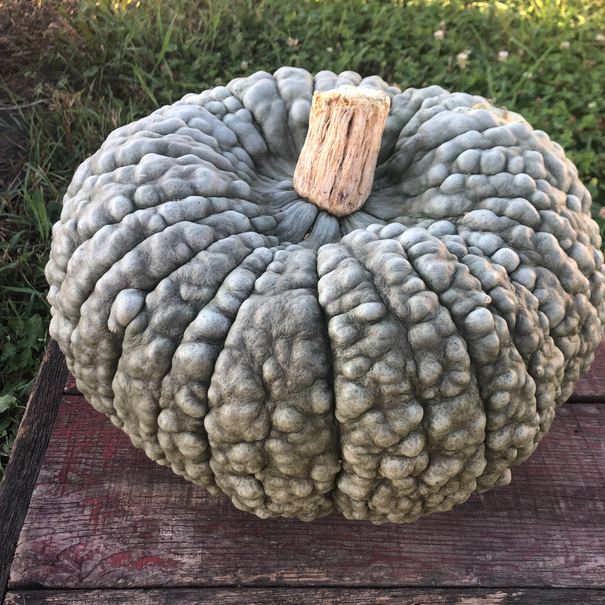 Delicious, sweet, dry orange flesh and beautiful grey-green warty skin. These Italian heirloom pumpkins are grown by the sea and used to make soup, gnocchi, lasagna and stuffed ravioli. They are so ornamental you may not want to eat them— but do, they are one of the best tasting winter squashes we have grown. The fruit are somewhat inconsistent in shape but most of them are turban shaped and all of them are beautiful. Average 2 fruit per plant. Great storage squash.