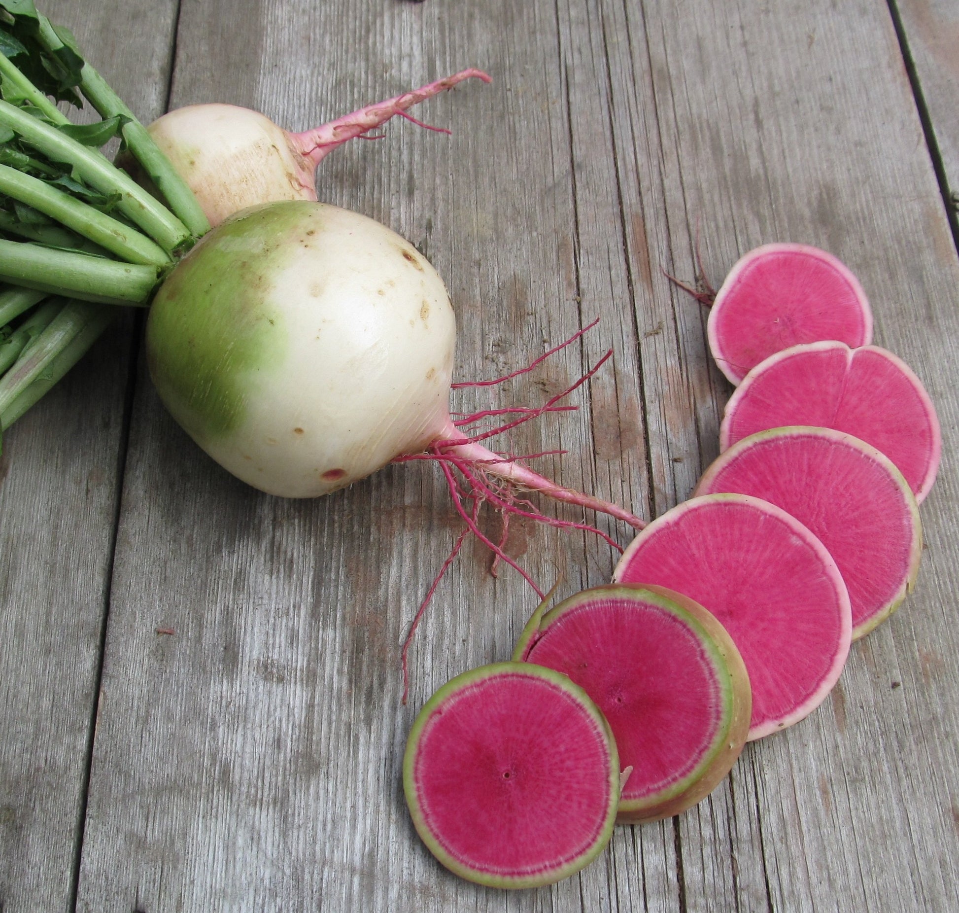 Large colourful winter radish. Grow these beautiesin mid to late summer and harvest around first frost for winter storage. Cut open the light green 10-15cm radish and you’ll be wowed by the bright reddish pink flesh within. The taste is a bit like a sweet turnip with a bit of radish mixed in and they make some pretty tasty winter salads. If you are a kimchi fan, try making some with Misato Rose. Colourul and delicious.