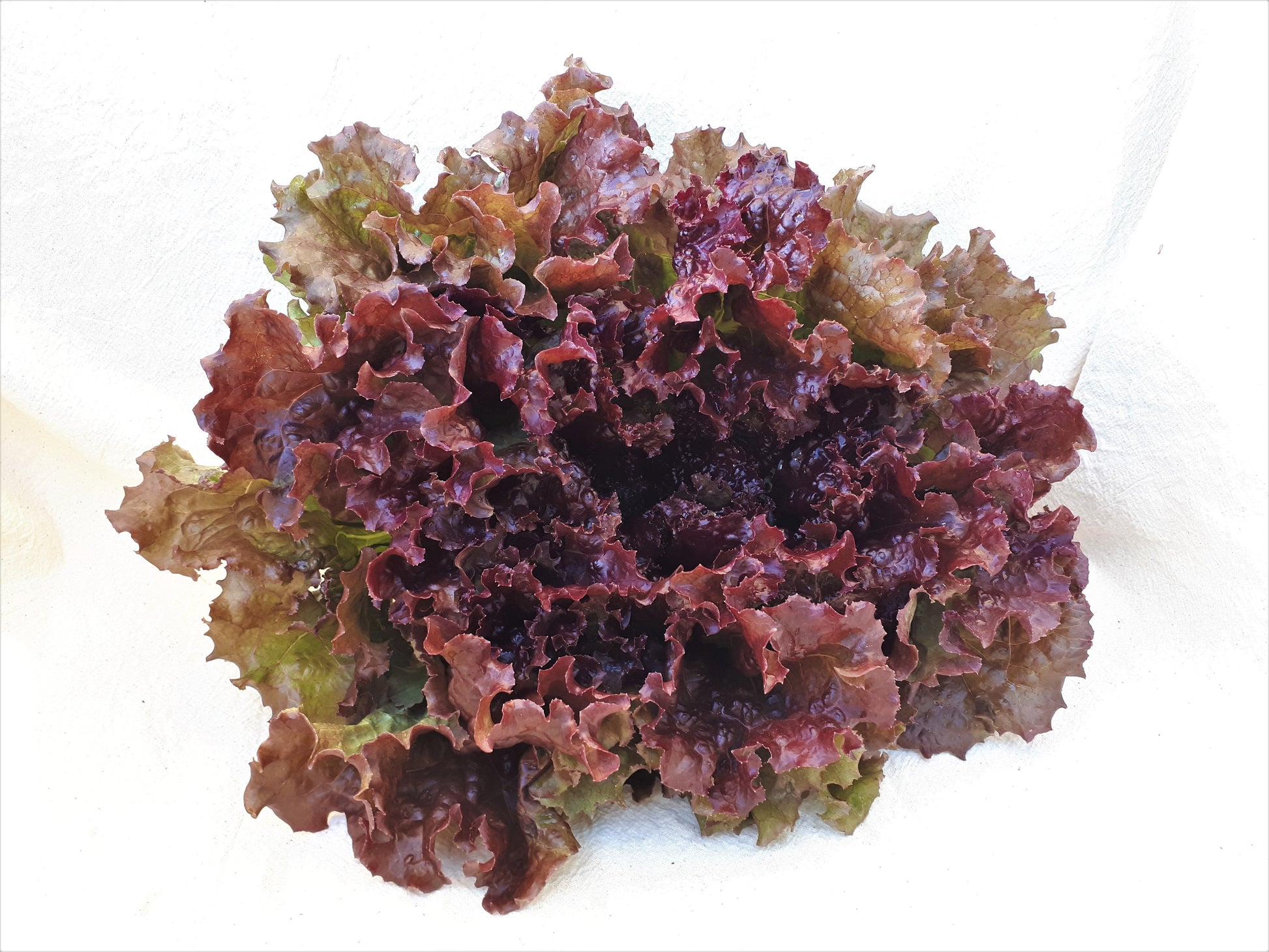 Frilly red leaves top a bright green base on large upright heads. The crisp leaves have a sweet flavour that holds well into summer, one of the last to bolt to seed in our lettuce patch. Good at the baby leaf stage or as large loose heads. Provides loft as well as colour in the salad bowl. A grower favourite.