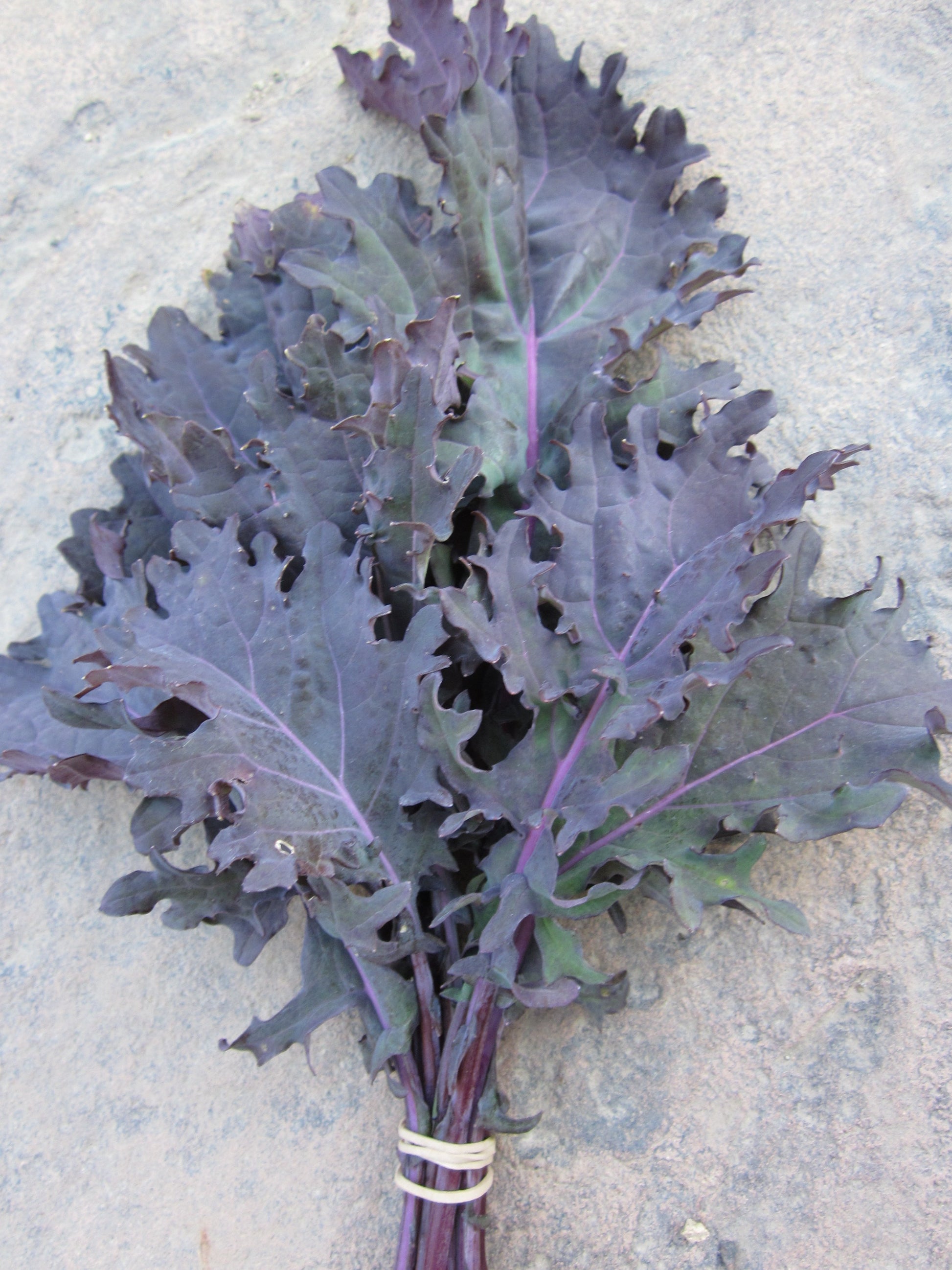 Brassica napus. This heirloom kale has sweet, tender young leaves that work great in mid-summer salad mixes. Mature leaves can be bundled up as bunching greens. The gray-green leaves have bright purple stems and toothed margins. Very pretty in the ornamental kitchen garden.