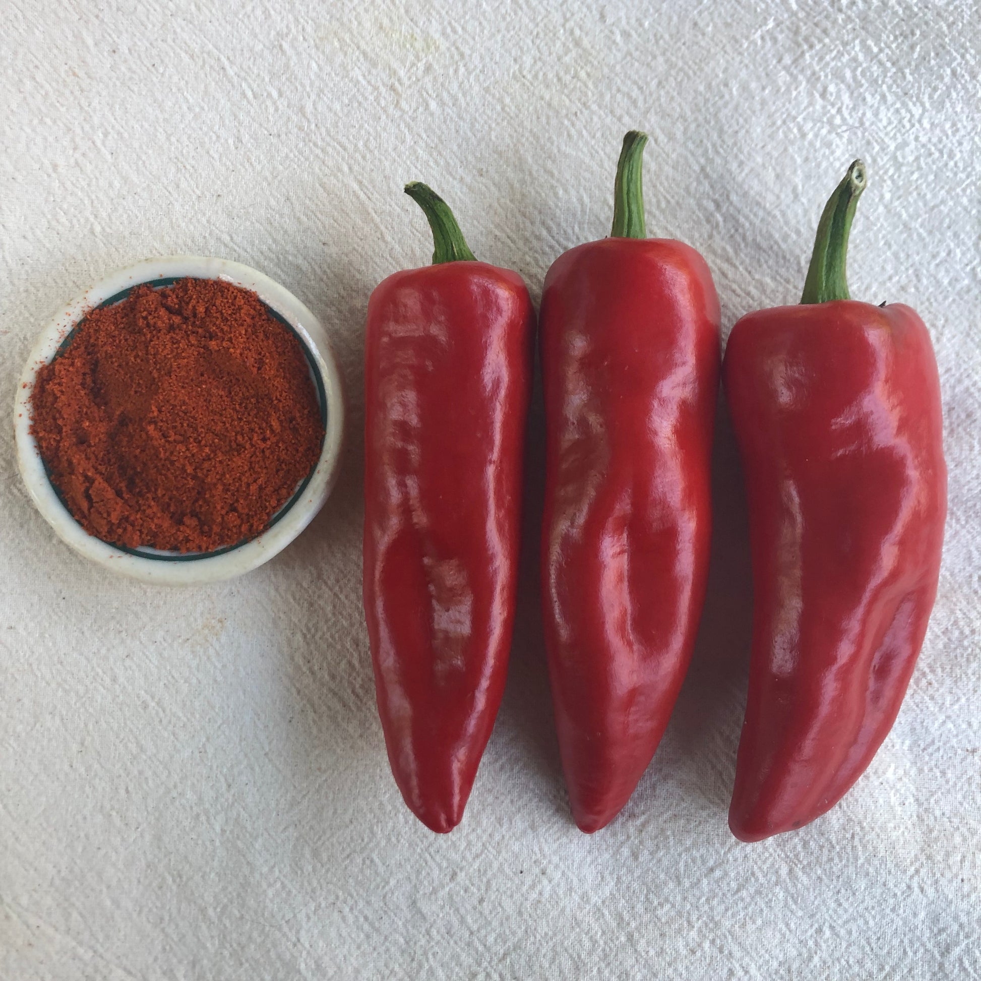 Grown in the Basque region of France for over 400 years this celebrated pepper is traditionally strung into ristras, dried, and then ground into a mildly-hot powder that is the soul of Basque cooking. With a Scoville rating of 4,000 the heat level is similar to that of black pepper and the flavour is warm, rich and fruity with just a touch of sweetness. Strong, branching plants are very productive in our zone 5 fields producing loads of upright clusters of 12–15 cm (5–6") long, tapered fruits that dry beautifully. Grow them in the garden or in pots and provide a stake to hold the heavy clusters of fruit. This one will be a work horse in your kitchen.