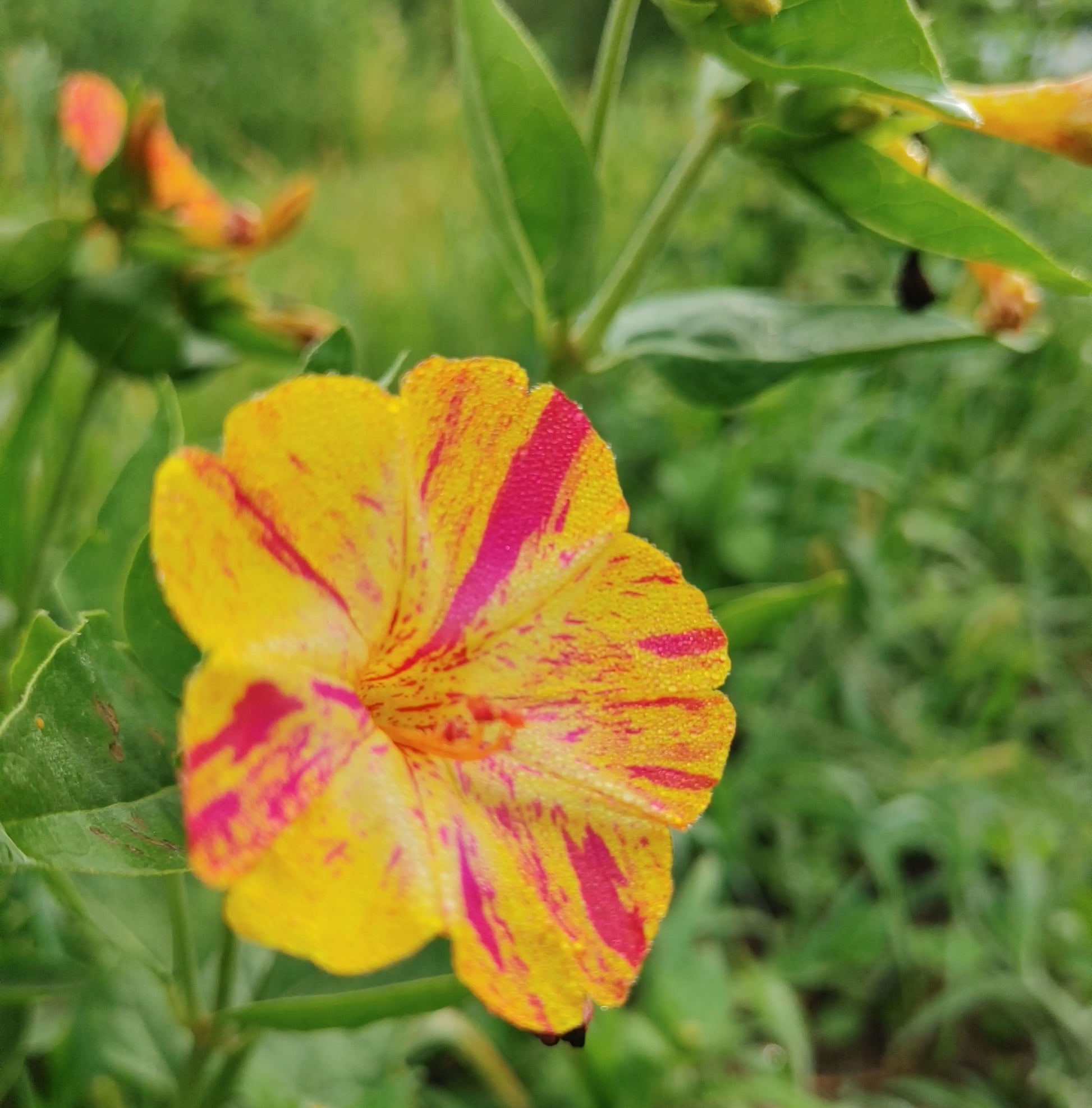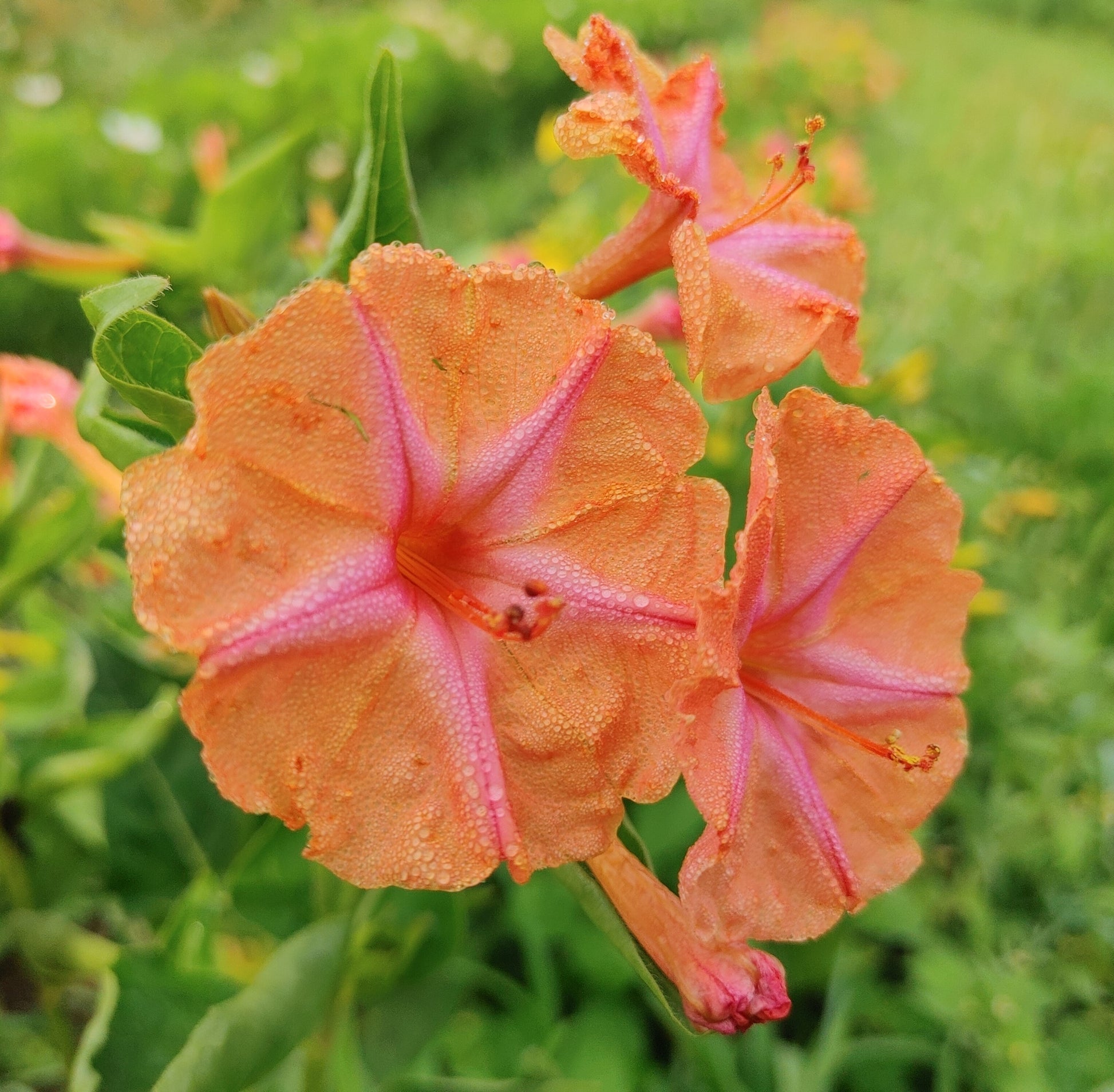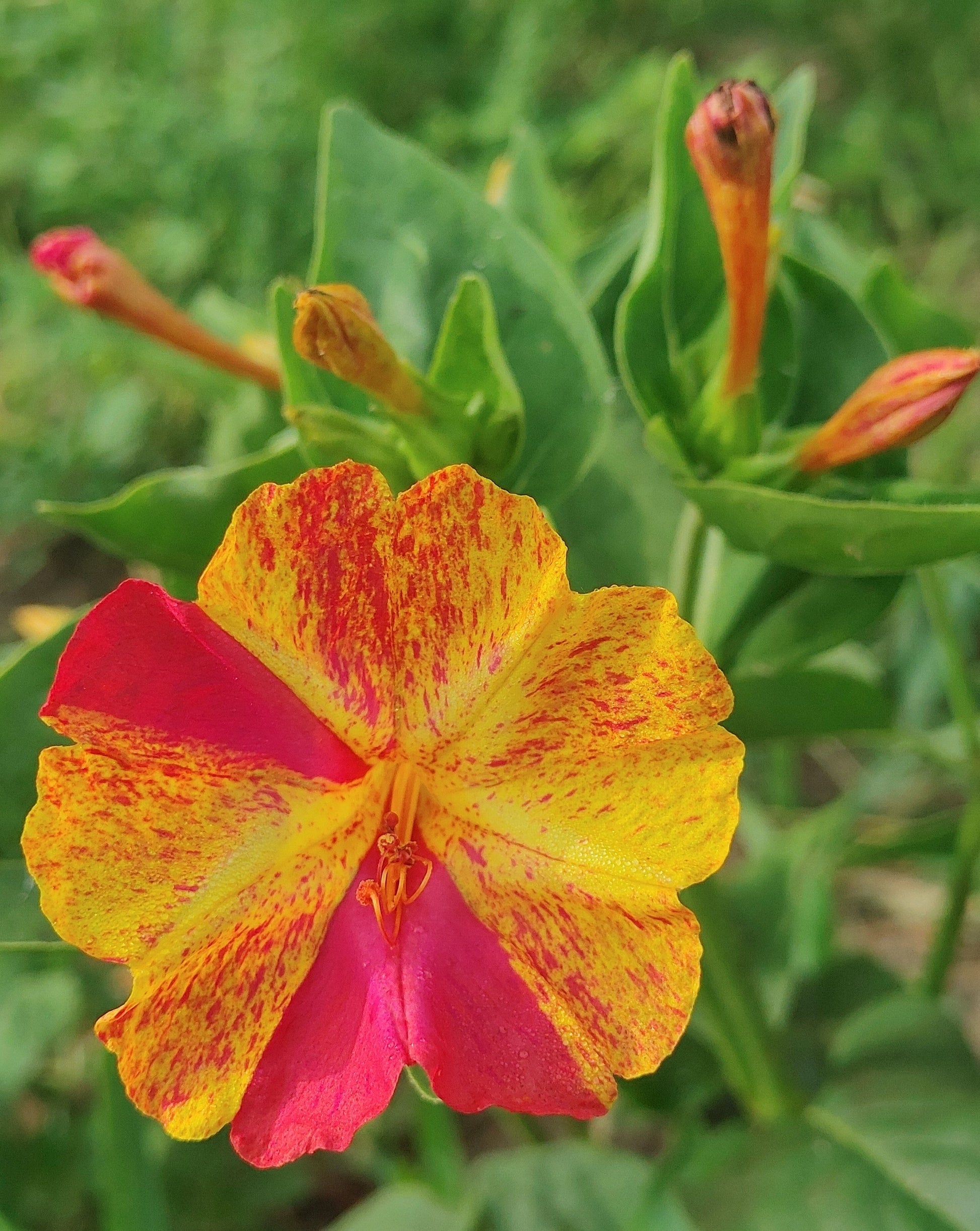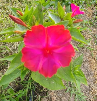 We love growing four o’clocks for their sweet citrusy scent that drifts through the night air after the blossoms open between 4 and 8pm. The oboe-shaped flowers stay open all night long. Shortly after opening the butterflies and hummingbirds visit and as darkness appears the night flying Hawk Moths come to feed on the sweet nectar. These are quick growing, metre tall, bushy plants that flower prolifically from mid-summer thru fall. They are perennial in tropical and sub-tropical regions but we grow them as annuals. You can lift the tuberous roots to winter indoors and replant the following spring. Strega flowers come in combinations of vivd pink, salmon and bright yellow. Some are solid colours and many are mixtures of all three colours. There can be flowers of different colours on the same plant. The original seed was collected in Italy by Lane Selman and this variety is brought to us through a collaboration between the Culinary Breeding Network and Uprising Seeds. Thanks so much.