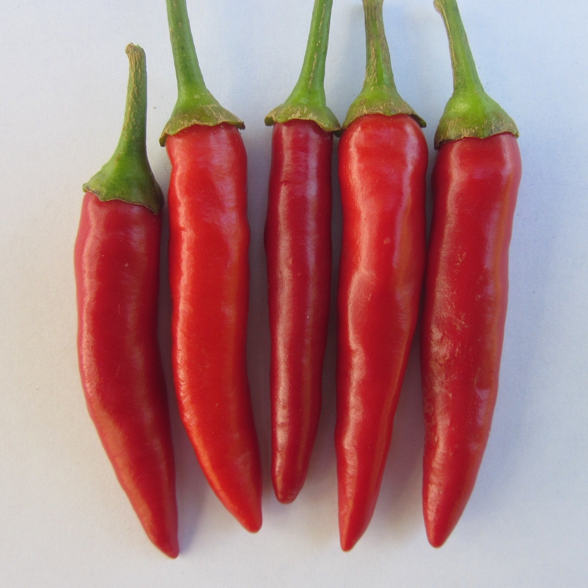 Fire-in-your-mouth hot and fruity at the same time. This open-pollinated selection of the hybrid hot pepper 'Super Chili' comes to us from the dedicated work of Roberta Bailey at Fedco Seeds. Compact plants are suitable for field or container growing and are just covered in upright, 5 cm long peppers that ripen from pale green to bright red. Like 'Super Chili' these plants produce heavy yields in hot dry weather, cold damp weather, sandy soil or heavy clay. Talk about resilient. Thanks Roberta.