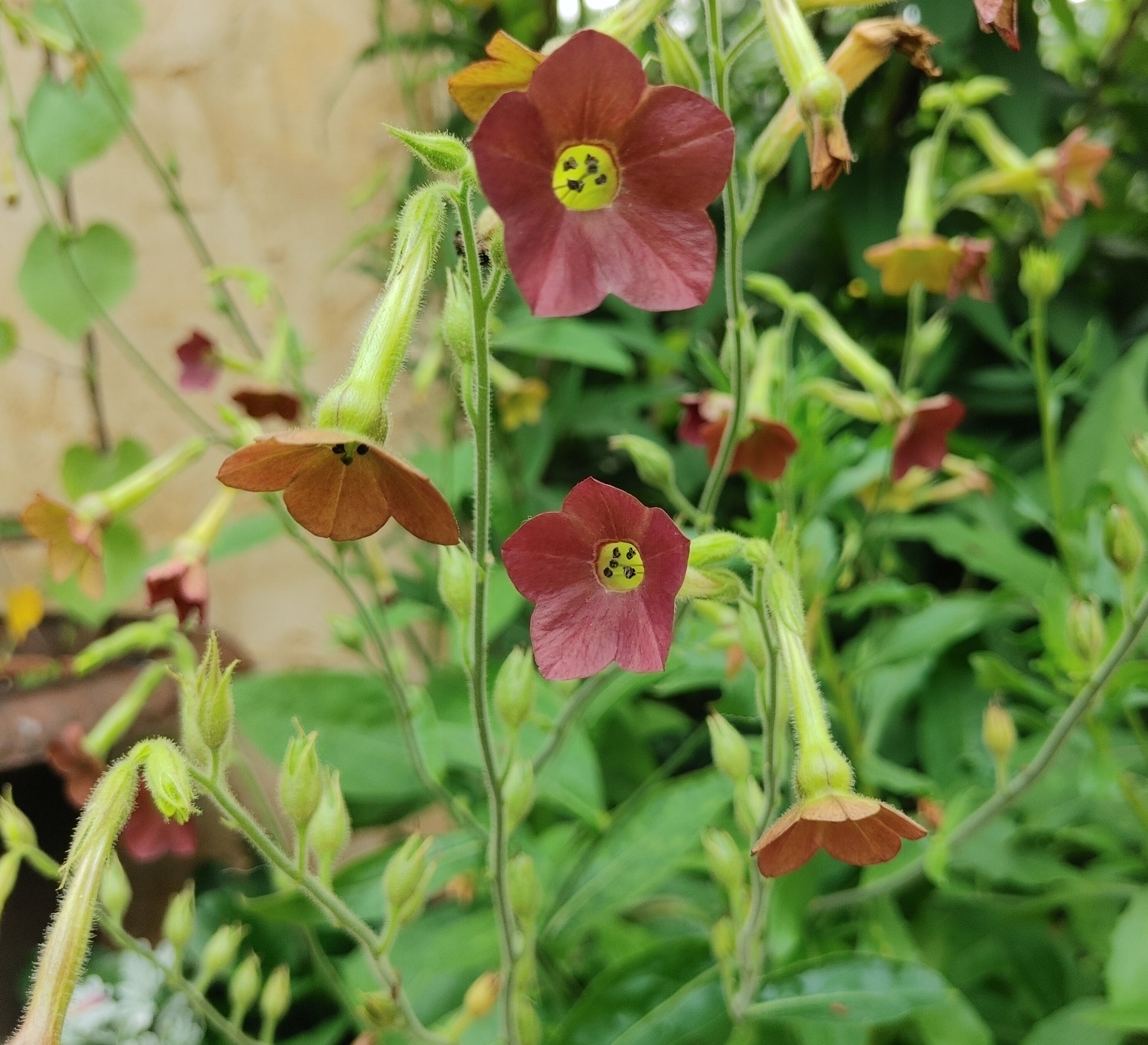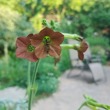 A delight in the flower garden. Delicate, tubular flowers in shades of dark cocoa, café-au-lait and a deep reddish brown are held high on stalks above a rosette of large tobacco like leaves. Great for the cutting garden and happy in containers this undemanding annual will reseed if left to go to seed. Loved by pollinators and hummingbirds. Disliked by deer. Rare.