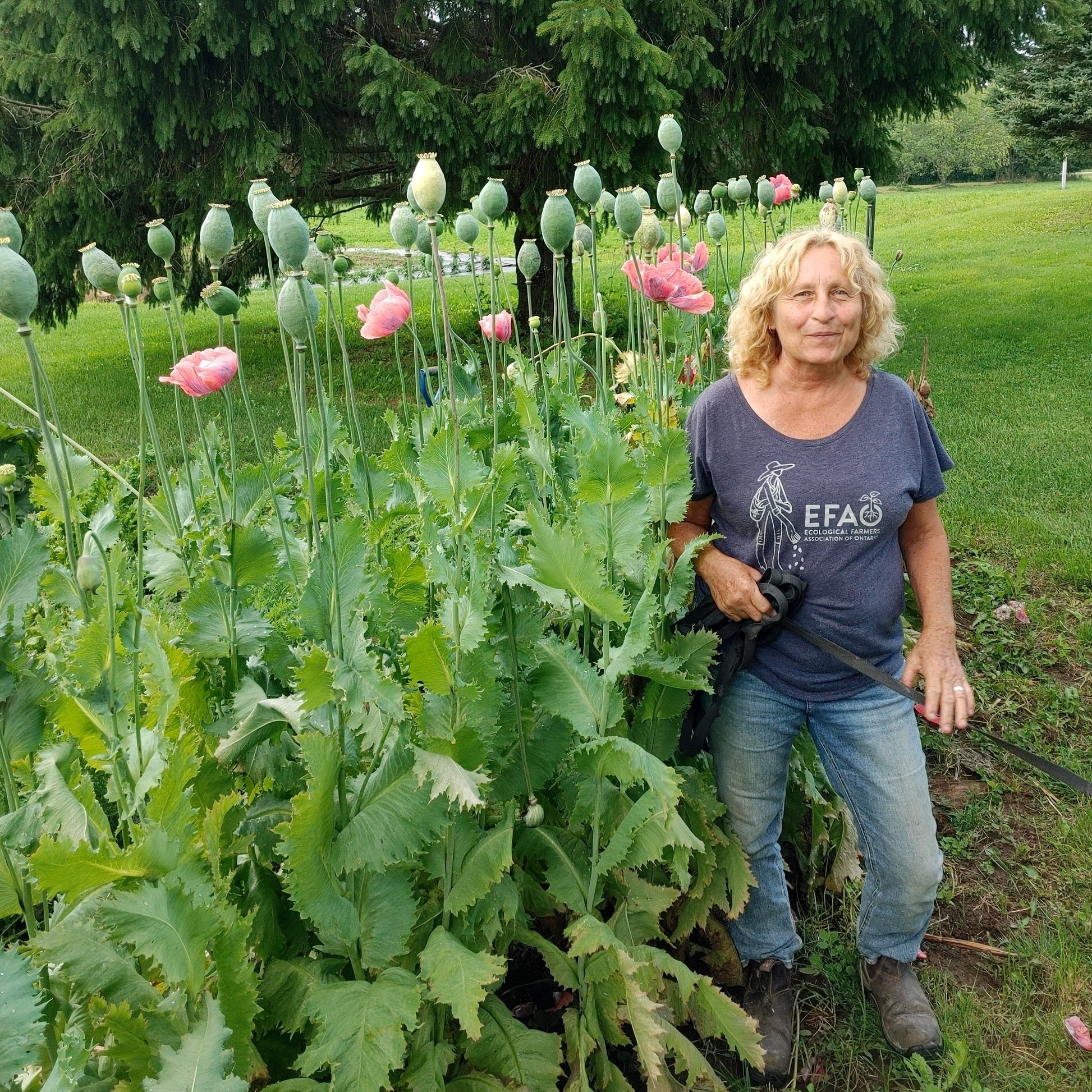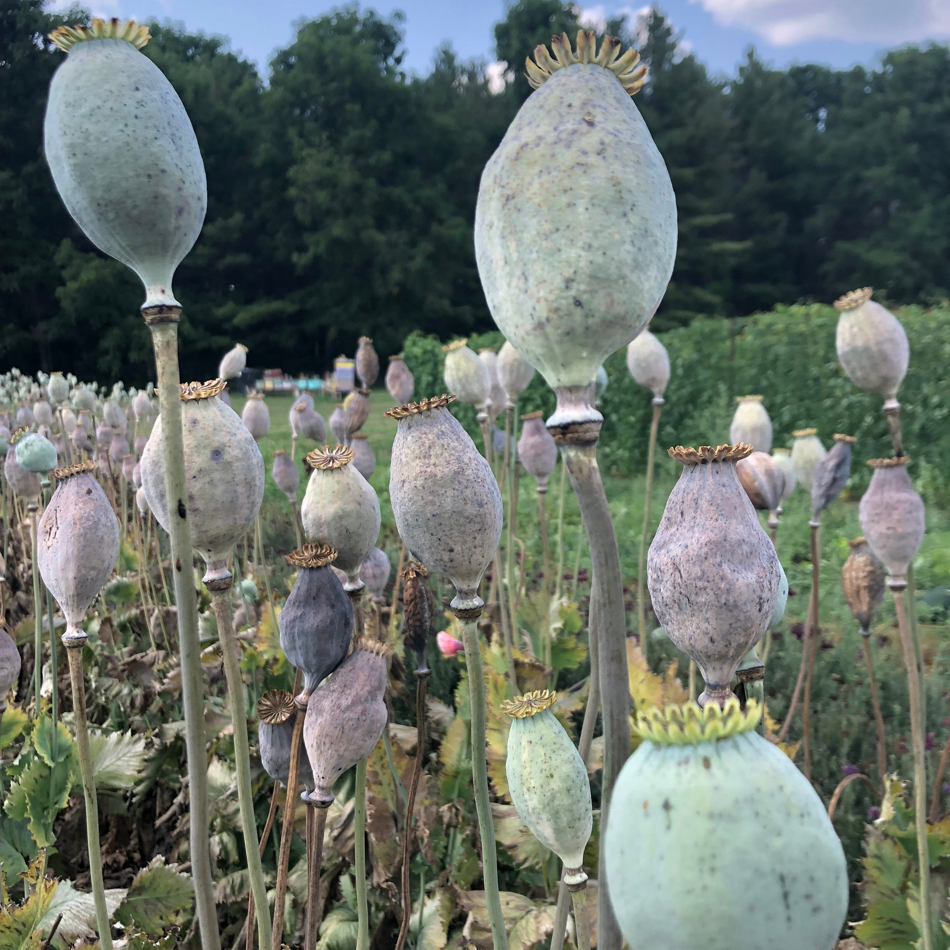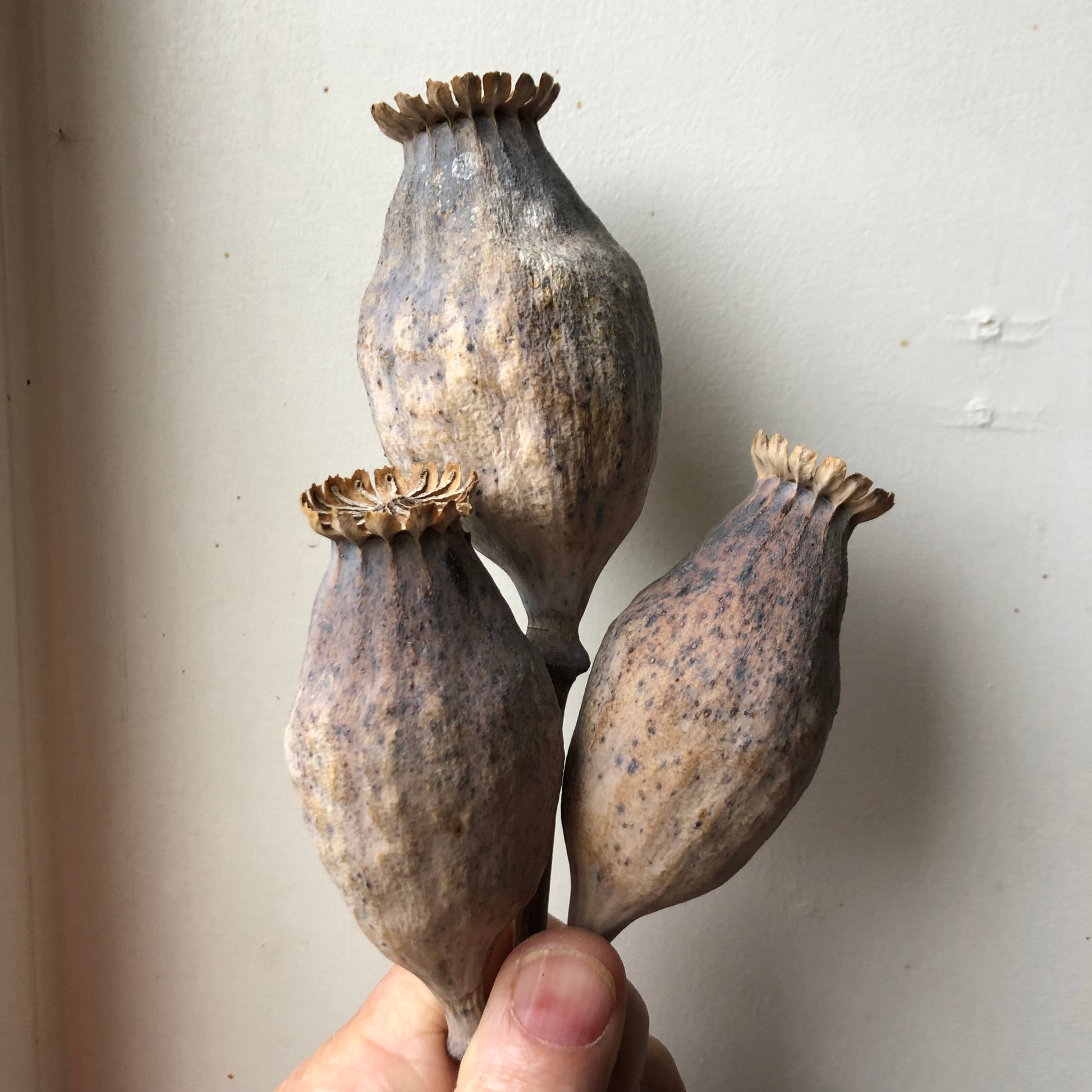 Huge, elongated seed pods are blue-grey when fresh and dry down to a soft chamois and grey colour. They are beautiful in the vase as well as in swags and wreaths. Silky flowers are pink with splotches of lavender-purple above glaucous blue-green foliage on plants that reach over 1.5 m. Each pod is filled with an abundance of edible blue-grey poppy seeds which are great in baking, grain bowls and salad dressings. It is a farm tradition around here to have lemon poppy seed cake for staff birthday lunches. Easy to grow, self-sowing, and breathtaking in mass plantings.