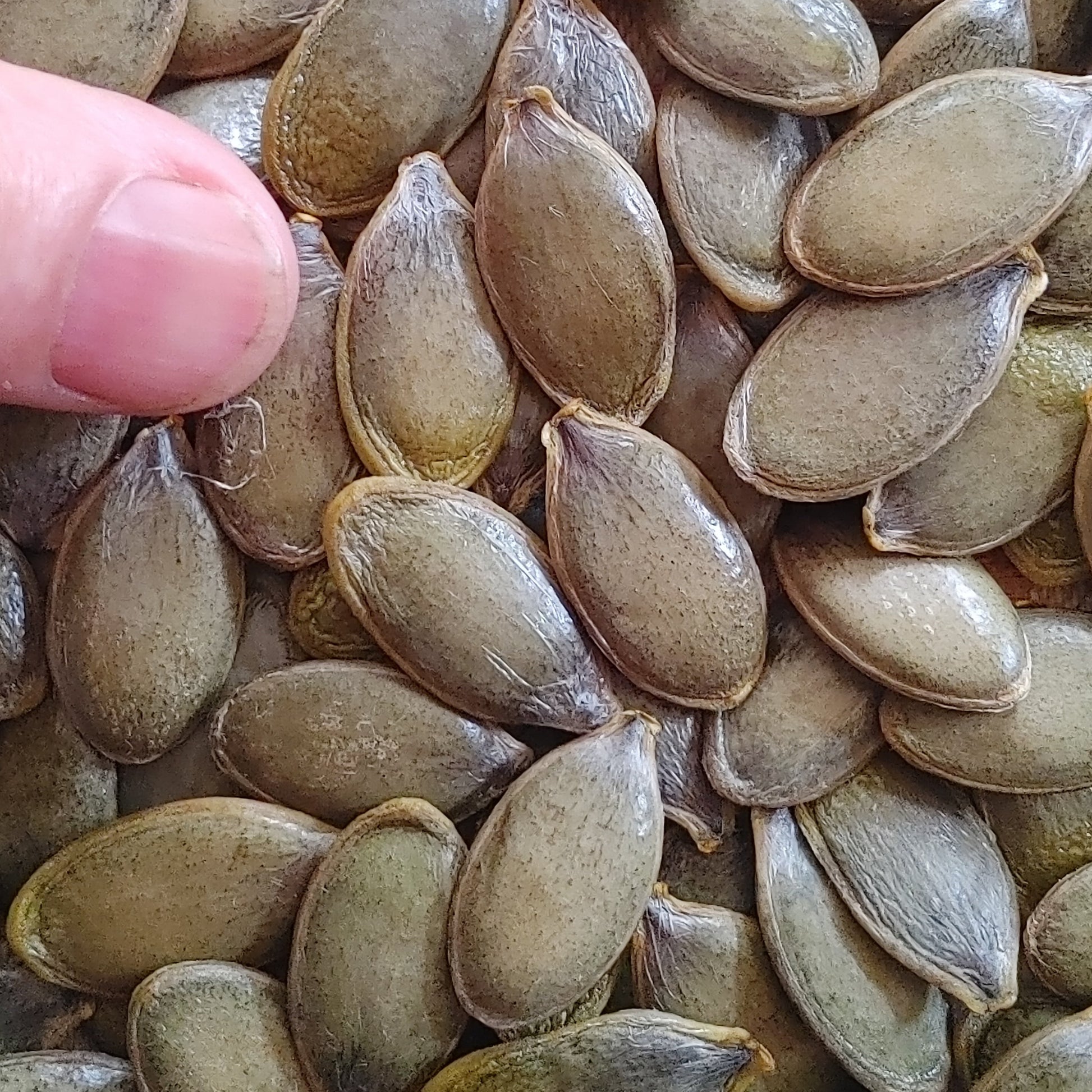 Grow your own pepitas. This gem of a pumpkin is the result of a chance, natural mutation that occurred in a field of pumpkins in Austria in the early 1900’s. No doubt bees were involved! The mutation was in the seed coat. Instead of the hard white, tasteless seed coat normally found on pumpkin seeds, these seeds are hulless. You can eat the entire delicious, nutty tasting seed and each pumpkin is full of them. They are extremely nutritious with too many health benefits to list here. In Austria the seeds are pressed to produce a golden, nutty, nutritious oil. Vigorous vines produce 5-6 green and gold striped pumpkins weighing between 3-5kg each. Flesh is very mild and is often fed to the chickens but we know some people that use it as a late season zucchini substitute.